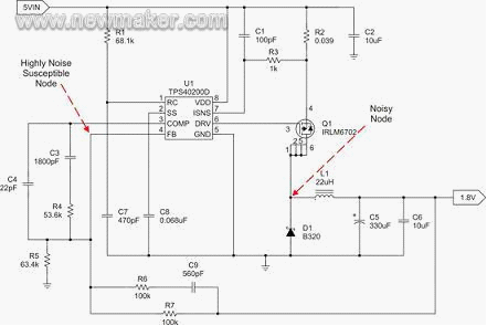 最嚴(yán)重的寄生電容問題通常會涉及反饋(FB)電壓以及誤差放大器補(bǔ)償節(jié)點(diǎn)的布局。這是由于誤差放大器輸入的高阻抗、誤差放大器的高增益,以及大量連接至該節(jié)點(diǎn)的組件。圖1顯示了典型控制器中出現(xiàn)這一問題的位置,以及一個(gè)較為可能的耦合節(jié)點(diǎn)。Q1和D1之間的連接約有0.1V/ns到1V/ns的極高轉(zhuǎn)換速率,并且會形成僅1pF寄生電容的1mA電流。